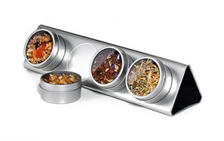 亚光银的底座上可陈列4个带有可见窗口的圆形锡罐/尺寸328*80*80mm